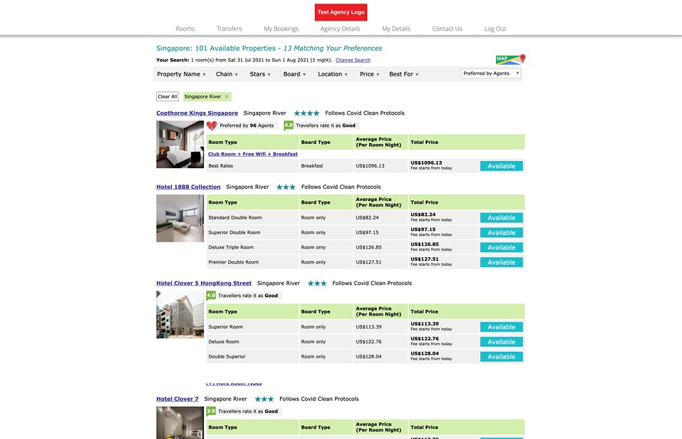 A split-screen view with price pins colour-coded by retail margin. Agents can zoom, search within the map, and immediately see where hotels sit relative to transport and landmarks — without switching modes.