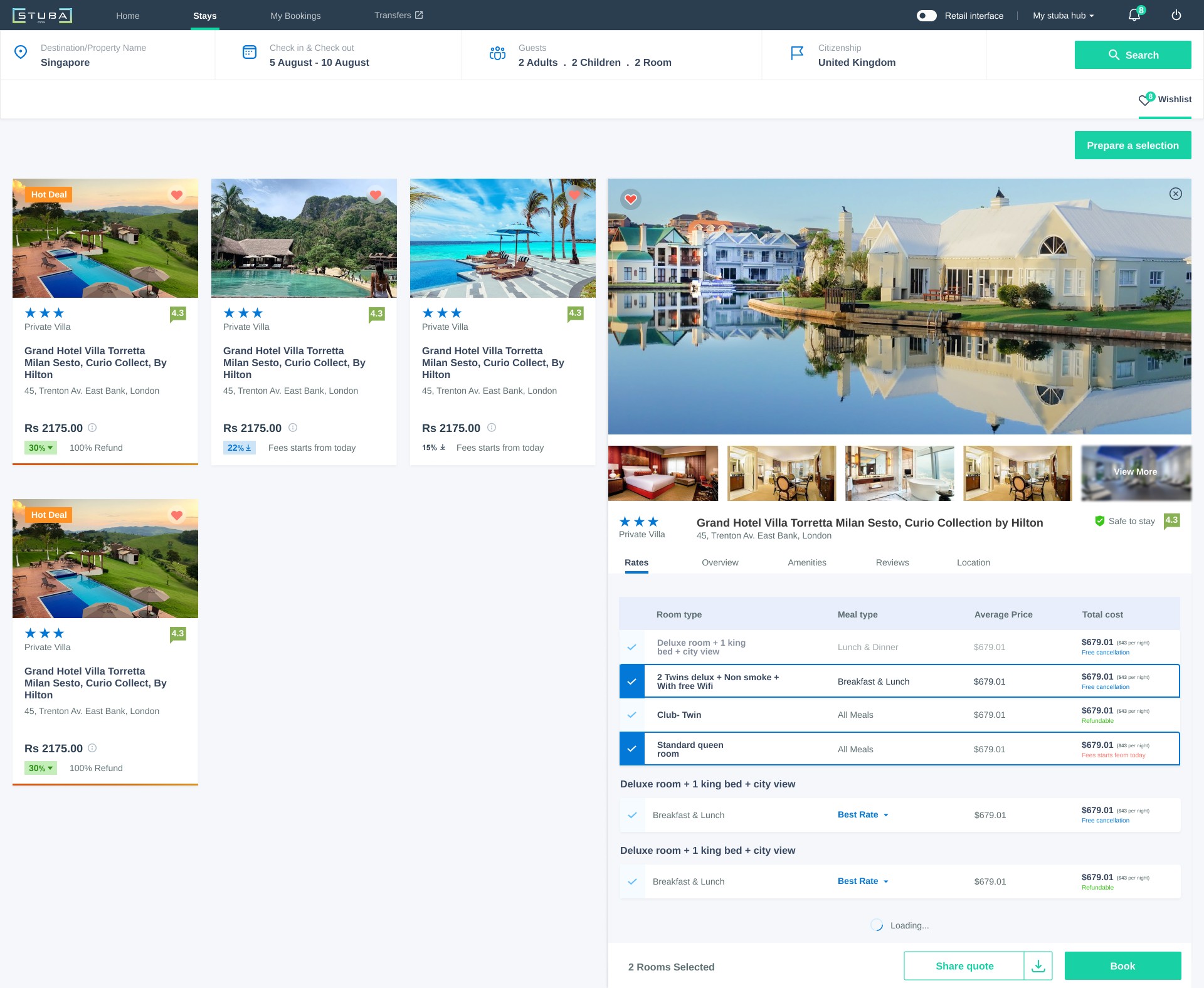 A wishlist-to-quote flow where agents shortlist hotels, generate a side-by-side comparison of room types, rates and cancellation policies, and send it as a branded email or PDF — with prices hidden if needed — without leaving the platform.