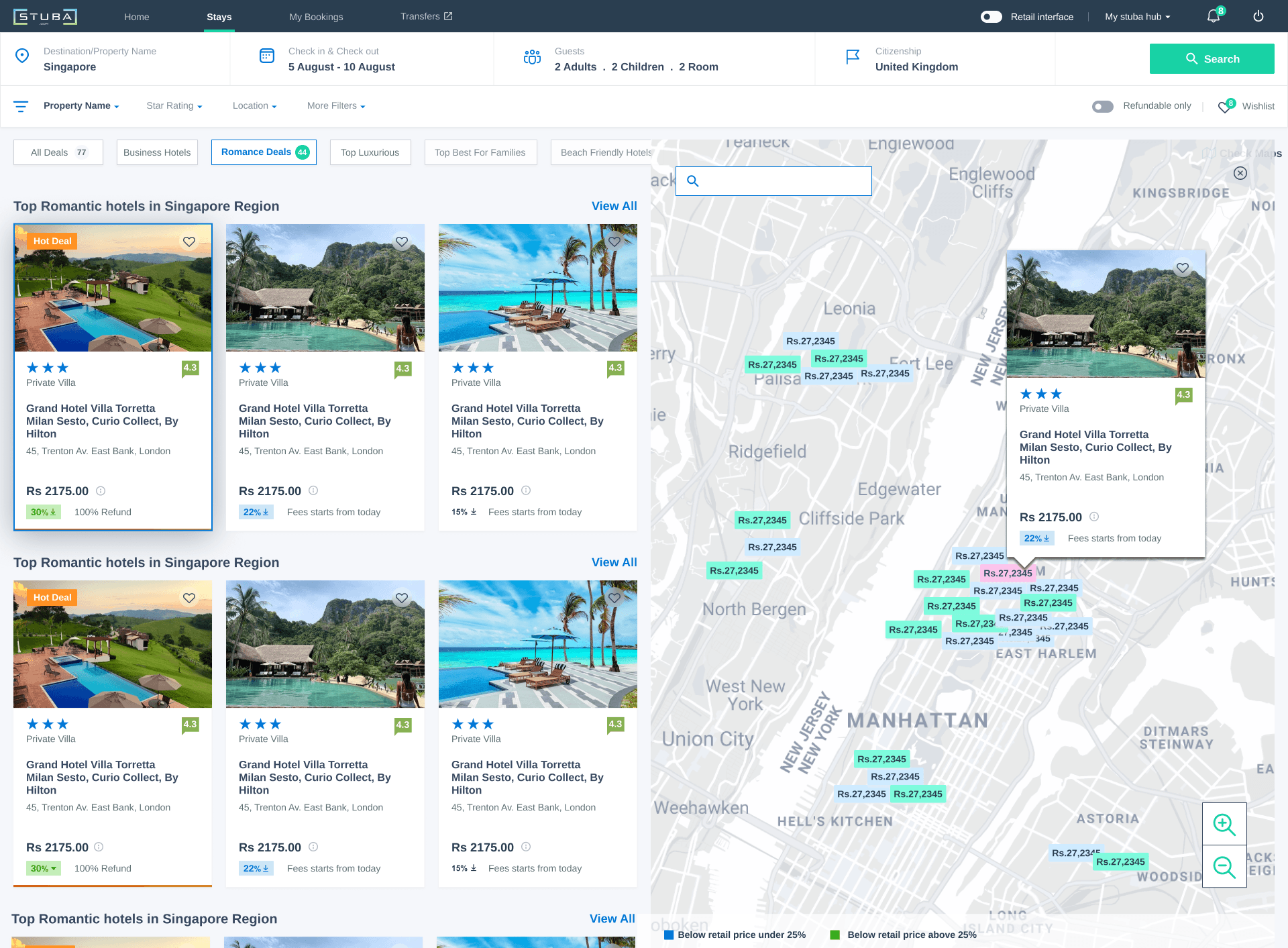 Travel agents on Stuba scrolled through hundreds of hotels to find the right one. I redesigned search to surface hotels agents were most likely to book using past bookings and peer trends, while keeping full inventory accessible. The platform launched globally and reduced search time by 20%.